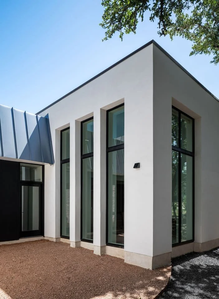 A cantilevered entrance lends the structure a sense of weightlessness, while a serene infinity pool anchors the outdoor experience. Every material choice is in conversation with the rugged Hill Country landscape, grounding the home in its surroundings without competing with them.